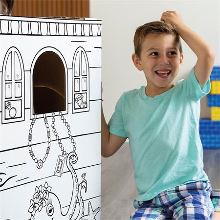 Az XL méretű játszóház ösztönzi a célirányos szerepjátékot, a nyelvi fejlődést és a mesemondást, miközben a gyerekek kifestik, díszítik és személyre szabják a saját terüket.